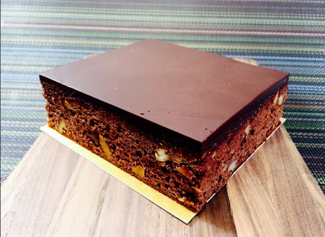 写真は『ブラウニー』という商品で、スペイン産チョコヴィック社製クーベルチュール、カカオ分64.5%のトバドを使用した生地に、ローストしたクルミを入れて焼きあげた香ばしい味わいのチョコケーキです。