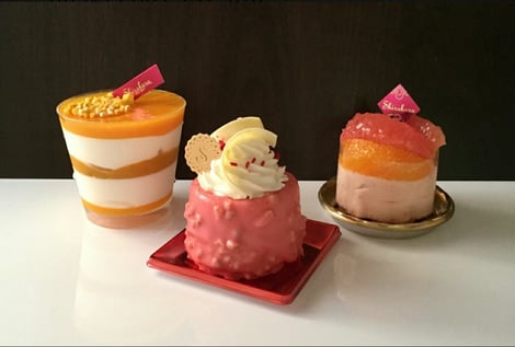 5種類のベリ一を使ったジュレを自家製のいちごピューレで作ったムースの中に入れて、アーモンド入りのチョコでコーティングしています。味も見た目もキュートに仕上がりです。