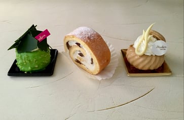 宇治抹茶を使ったムースと柚子風味のムースを重ねあわせ、アーモンド入りのチョコレートでコーティングしています。By.Sue ChefTakeuchi