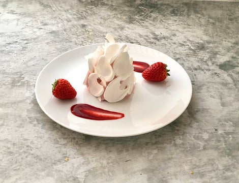 ヘーゼルナッツのパウダーを使って焼き上げたダックワーズの間に、すりおろしたレモンの皮を加えたバタークリームと、いちごとフランボワーズのコンポートをサンドして、神石産のフレッシュないちごを載せて、いちご風味の生クリームをナッペしています。外側には花びらのようなメレンゲを貼り付けて春の装いに仕上げています。