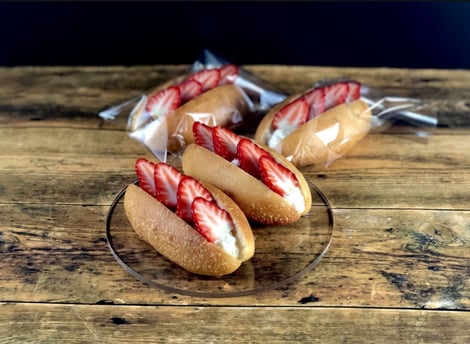 江別製粉社製北海道産強力粉「香麦(こうむぎ)」を使って焼き上げた、ふんわり・もっちりとした香り豊かなコッペパンに、マスカルポーネチーズをブレンドした生クリームと、大粒の神石産いちごをサンドしています。今回の苺サンドのために考えた配合で焼き上げたパンの食感と、瑞々しい苺の味わいがチーズ&生クリームとマッチした特製フルーツサンドをどうぞお楽しみ下さいませ。