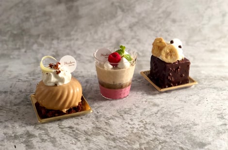 滑らかで香ばしいアーモンドムースの中に、キャラメリゼしたアーモンド入りのココナッツのムースが入っています。ゴールドチョコを使ったコクのある上がけでコーティングして、底にはヘーゼルとアーモンドの食感が楽しめるチョコレートのスポンジを敷いています。