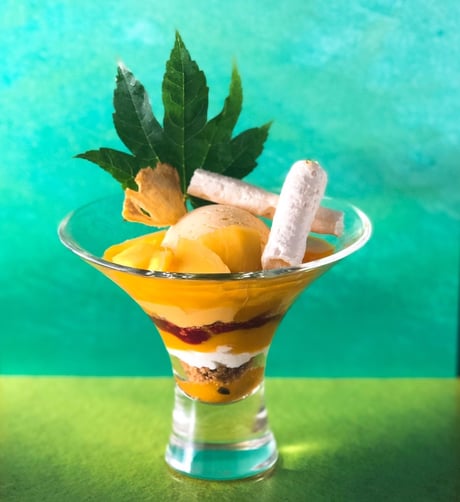 マンゴーの果肉とオレンジの果皮が入ったアイスクリームを載せて仕上げています。