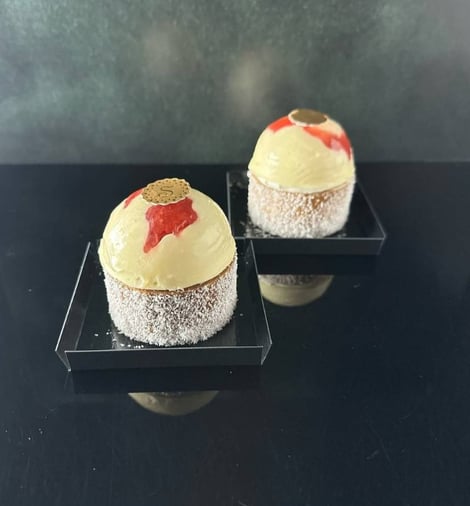 フランボワーズジャムが入ったフロマージュのタルトに、ドーム型のマスカルポーネムースを載せています。ドームの表面には苺のコンポート、中には柚子のミンチが入ったゼリー。タルトの周りにはココナッツをまぶしています。