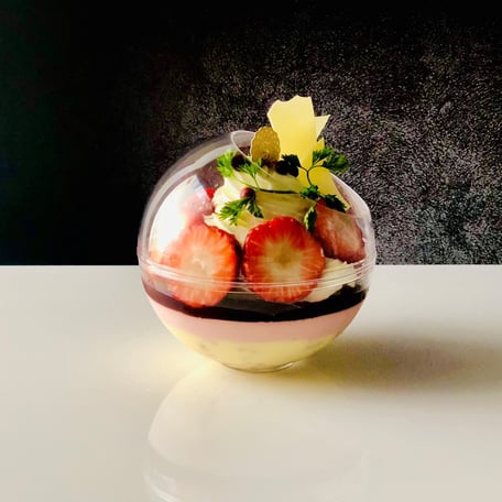 ライチと白ワインのジュレが入ったルビーチョコのムースをメインに、ほんのりとローズが香フランボワーズのジュレや、サクサク食感の苺チョコ、シナモン風味のシュトロイゼルをフレッシュな苺と一緒にボリューミーに盛り付けています。