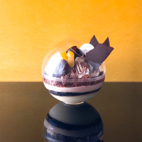 抹茶チョコのザクザクが入ったバニラムースに、黒みつのジュレと刻んだ黄栗の入った抹茶ムースを組み合わせ、抹茶クリームでモンブラン風に仕上げています。和風の味わいをお楽しみ下さい。