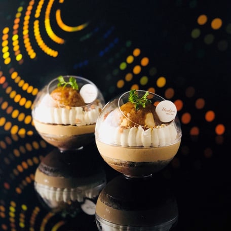キャラメリゼしたリンゴとレーズン、アーモンド、コーヒーゼリー、コーヒームース、チョコクリームが層になっている、ちょっぴり大人なパフェに仕上がりました。リンゴの酸味とレーズンの風味、チョコレートの甘さが、絶妙にマッチしています。