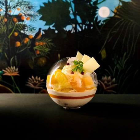 ゴールドチョコレートを使ったザクザク食感のクッキー入りココナッツムースに、マンゴーの果肉を入れたマンゴー&パッションフルーツのジュレとバナナムースを組み合わせています。
