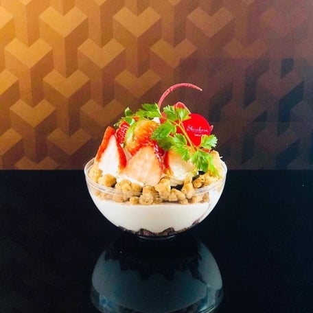 神石高原町 JINSEKI 15 FARM で栽培された「紅ほっぺ」を使った苺パフェ。ジューシーでしっかりとした甘みもある紅ほっぺを味わっていただくために、苺と相性の良いチョコレート&チョコクリームを載せて、下には3層のムースをあわせています。
