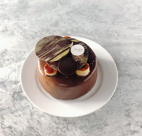 イタリア・イカム社製クーベルチュールカカオ分72%「ダークバニーニ」と「ラテペルー」を使った滑らかなムースの中に、バナナ&パッションのジャムとキャラメルソース、ショコラとオレンジのクリームが入っています。サクサクしたフィヤンティーヌを底にしいてます。濃厚なショコラの味わいとフルーティな香りで至福のひとときをお楽しみにください。