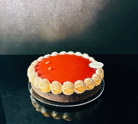 南米エクアドルで栽培された豆から作られたカカオ分65%のクーベルチュールを使ったショコラタルトに苺&柚子のジュレをのせました。濃厚なビターショコラの味わいと苺のジュレのさわやかな味わいが広がります。。
