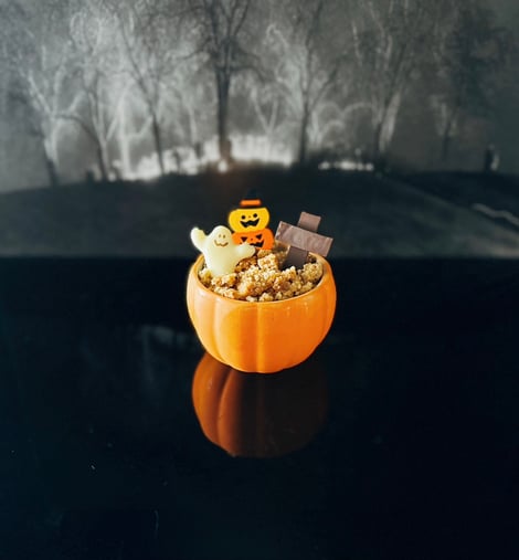 かぼちゃの陶器にかぼちゃのプリン。シュトロイゼルの食感がユニークです。