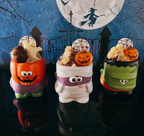 モンスター陶器の中はこくうまプリン。3種類の味わいのクリームを絞っています。