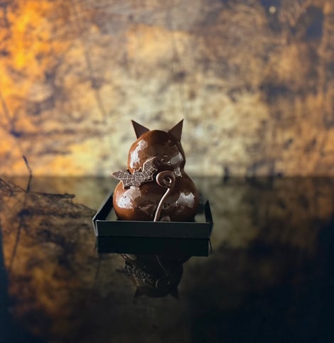 バニラムースとフランボワーズのジャムが入ったビターチョコムースの胴体に、頭はフランボワーズショコラ。向こうを向いた黒猫の可愛いシルエット