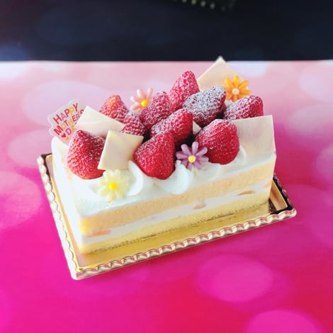 しっとりと柔らかなスポンジの間には口どけの良いコクのあるなまくーrムと黄桃をサンドしています。フレッシュな苺とチョコレートの小花を載せて可愛く仕上げました。