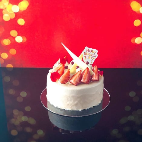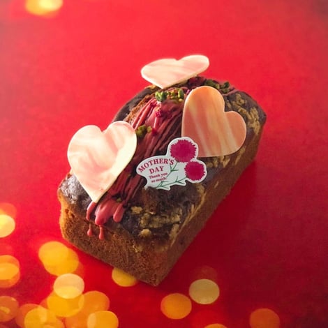 あまおういちごのペーストをブレンドして焼き上げた、いちご風味のパウンドケーキ。ベリーの果肉も入ったリッチな味わいです。ハート形のホワイトチョコを載せて、母の日仕様にデコレーションしています。