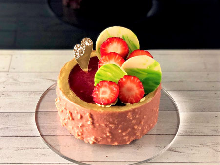 味わい深いピスタチオムースの中に苺ムースとフランボワーズジュレ、ザクザクっとした食感が楽しめるフィヤンティーヌとジョコンドが入っています。外側をアーモンド入りの苺チョコでコーティングした華やかな仕上がりです。